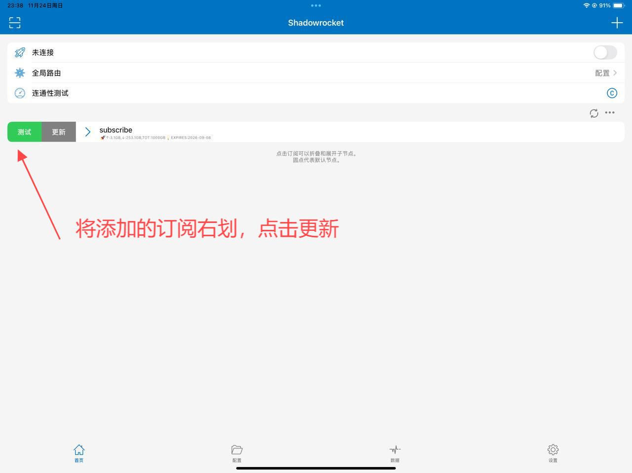 有时订阅节点需要更新,点击“订阅”界面中的“更新”按钮来手动更新节点。