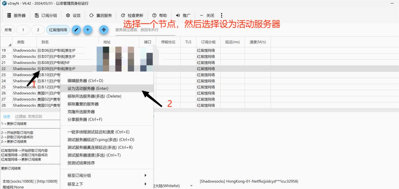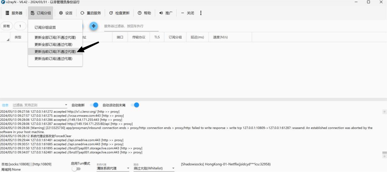 Step 4:确认添加后,点击“更新订阅”,V2RayN 将自动从订阅地址中获取配置并加载节点。